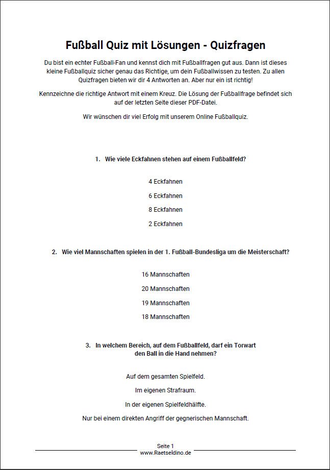 Entdecke spannende Fußball-Fragen und teste dein Wissen mit unserem kostenlosen Fußball-Quiz-PDF. Auf der letzten Seite findest du alle Lösungen. Viel Erfolg beim Mitraten!