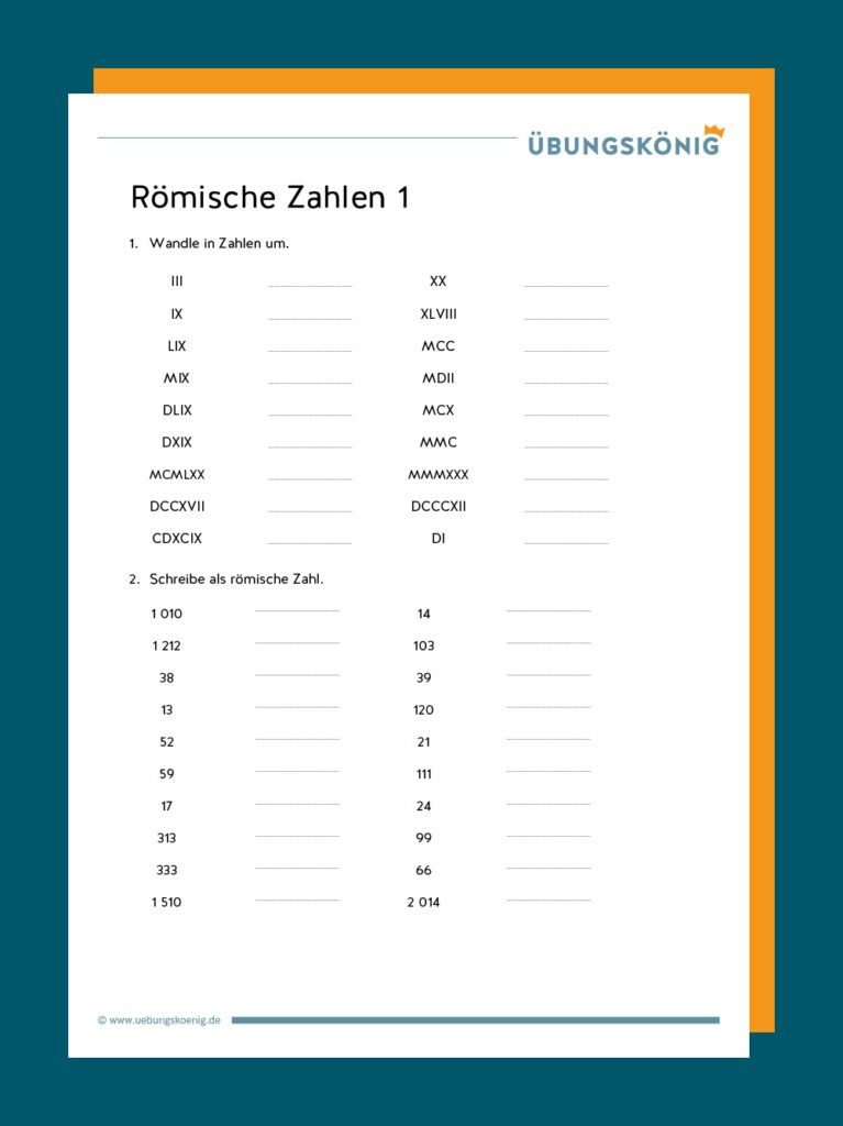 Löse Aufgaben mit römischen Zahlen! Laden Sie unseren PDF-Satz herunter, um römische Ziffern zu verstehen. Perfekt für Schüler und Lehrer, die den Umgang mit römischen Zahlen üben und meistern möchten.